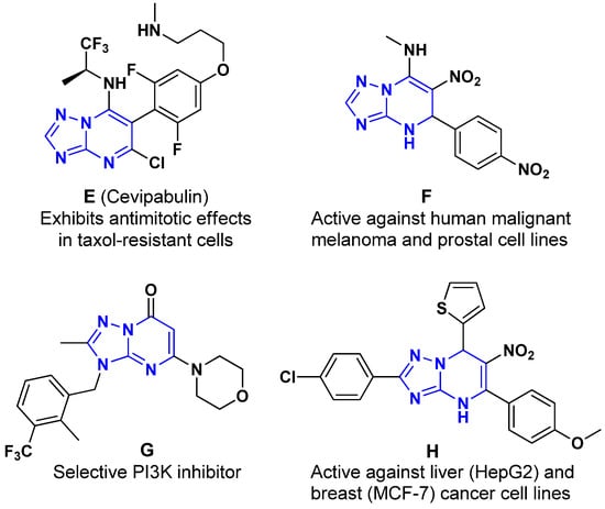 Azolo[1,5-a]pyrimidines exhibiting antitumor activity: E [22,23,24,25], F [30], G [26], H [27].