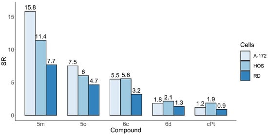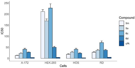 Compounds 5j and 6a possessed the least pronounced cytotoxic effect on cells (in all cases IC50 > 0.4 mM), while the greatest decrease in the viability of tumor cells was noted with the addition of compounds 5m, 5o, 6c, and 6d. It is important to note that these azolopyrimidine compounds are characterized by a more pronounced suppression of the viability of tumor cells A-172, Rd, and Hos in comparison with the effect on human embryonic kidney cells Hek-293 (Figure 3 and Figure 4).