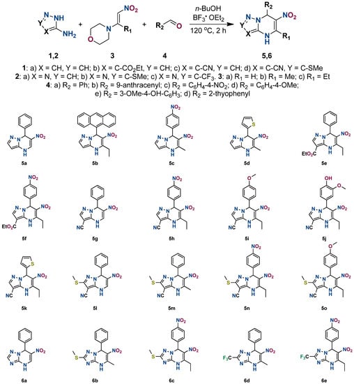 - Lyapustin, D.N.; Ulomsky, E.N.; Zanakhov, T.O.; Rusinov, V.L. Three-Component Coupling of Aromatic Aldehydes, 1-Morpholino-2-Nitroalkenes, and 3-Aminoazoles via Boron Trifluoride Etherate Catalysis: Reaction Pathway and Features of the Formation of Intermediates. J. Org. Chem. 2019, 84, 15267–15275. [Google Scholar] [CrossRef]