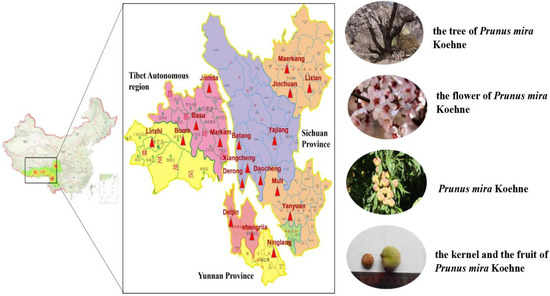 Prunus mira Koehne, a plant belonging to the Rosaceae family, is named P. mira in Latin and ཁམབུ། in Tibetan (Kangbu, Holdkan) [1]. It is the direct origin of peach in Yunnan Province and the southwestern of Sichuan Province [2], and it is a rare “living Fossil Group” of peach genetic resources in the world. It has the characteristics of fast growth, long life, drought and cold tolerance. According to Commonly Used Chinese Medicinal Materials Quality Sorting and Quality Research (1997) [3], P. mira is distributed in the border areas of Sichuan Province, Yunnan Province and Tibet Autonomous Region, as shown in Figure 1. The main distinguishing points of P. mira and other species, such as Amygdalus kansuensis (Rehd.) Skeels and peach, are smooth surface of the pit, absence of holes, and has shallow and wide longitudinal grooves. Both Jingzhu Materia Medica (ཤེལ་གོང་ཤེལ་ཕྲེང་།) (the classic Tibetan medicine), compiled by the renowned Tibetan pharmacist Diamer Danzeng Pengcuo over roughly a period of 20 years, was finished in 1743 [4], and Dictionary of Chinese Ethnic Medicine record that the kernel oil of P. mira can darken and grow hair, it can treat alopecia. In addition, the Dictionary of Chinese Ethnic Medicine also records that the burnt ash of fruits of P. mira can be used to treat trauma and constipation, and grasserie [5]. According to Sichuan Province Standard for Chinese Medicinal Materials (2010) [6], its efficacy is consistent with that of Amygdalus persica L., which is used in traditional Chinese medicine. Nowadays, in addition to the kernel of A. persica. and Amygdalus davidiana (Carrière) de Vos ex Henry, some kernels of P. mira in the market are for sale [7].