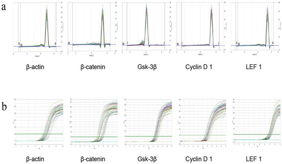On the 22nd day, the skin of the depilated area on the back of the C57BL/6 mice was collected, and total RNA was extracted from the dorsal skin tissue by using the RNA extraction kit (RE-03014, Forgene Biotechnology Co., Ltd., Wuhan, China). Total RNA was reverse-transcribed using the PrimeScript RT reagent kit (RR047A; Bio-Biology, Dalian, China) in accordance with the manufacturer’s recommendations. Reagents were added to the kit in sequence at 42 °C for 2 min. Genomic DNA removal reaction and reverse transcription reaction on the PCR machine are shown in Table 4 and Table 5, respectively. The full sequence of the gene was searched in the NCBI database. The Primer Premier primer design software was designed to screen specific primers for each gene and purified using ULTRAPAGE (Table 6). The real-time fluorescence quantitative PCR reaction is shown in Table 7 and Table 8. The β-actin of the sample skin tissue and the dissolution curves of the four indicators were all single peaks, which indicated that the amplified product was the target product of the corresponding gene and that primer dimers and nonspecific products were not observed (Figure 2a). The amplification curves of the tested genes were smooth and could enter the plateau phase, which indicated that the PCR reaction system and reaction program were set reasonably (Figure 2b). The CT value of each test sample in the PCR process was analyzed, and the relative mRNA expression of X was calculated by 2−ΔΔCT.