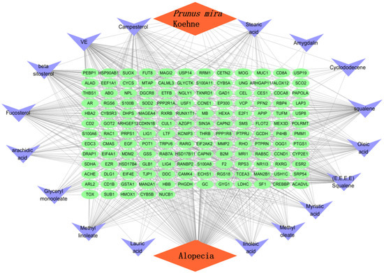 In accordance with the literature [13], a total of 17 chemical constituents of the kernel of P. mira were screened (Table 9). The SDF files of chemical components sought in the PubChem database were imported one by one into the Pharmmapper database for scoring. After the duplicate was deleted, the final corresponding targets were 5085, and targets with score higher than 0.6 were selected. After the duplicate was deleted, 216 targets were obtained. The GeneCards library was searched to obtain 9640 disease targets. After matching the two related targets, 149 potential targets for the treatment of alopecia diseases were obtained, and the Venn diagram was drawn (Figure 3 and Table 10). The network diagram of “the kernel of P. mira-components-Target-Disease” was established using the Cytoscape software (Version 3.7.1, Institute for Systems Biology, Seattle, WA, USA) (Figure 4).