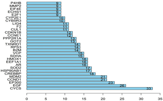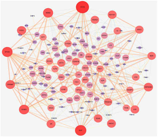 The network included 168 nodes and 842 edges. The relationship between the kernel of P. mira, chemical composition, potential target, and hair loss is demonstrated by different colors and shapes. Then, the “protein–protein” network topology was analyzed, and the PPI network was constructed using the String website (https://String-db.org; accessed on 23 May 2020) and Cytoscape, as shown in Figure 5. A large circle in the figure indicated an important gene. The degree of freedom was used as the selection condition for the hub gene. A high degree of freedom indicated high possibility that the kernel of P. mira will function through the target gene. The top 30 degrees of freedom were regarded as the hub gene, as shown in Figure 6.