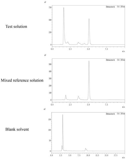 HPLC chromatograms of test solution, mixed reference solution and blank solvent.