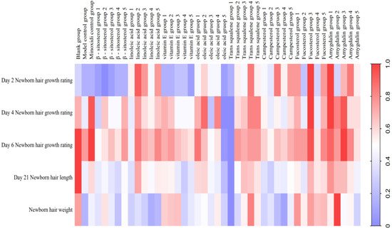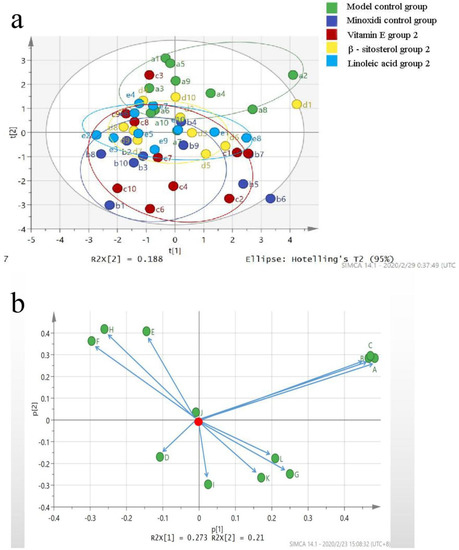 The SIMCA-P+ software (Version 14.1, MKS Data Analytics Solutions, Umea, Sweden) was used to perform principal component analysis. A total of 16 measurement indicators of the hair loss model (total number of hair follicles; number of primary hair follicles; number of secondary hair follicles; dermal thickness; and Cyclin D 1, β-catenin, GSK-3β, and LEF 1 mRNA and protein expression levels) were included. Five groups, i.e., model control group, minoxidil control group, β-sitosterol group 2, vitamin E group 2, and linoleic acid group 2, were used in this experiment.