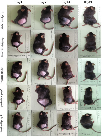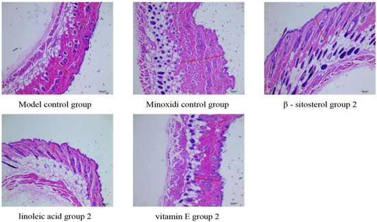 Vitamin E soft capsules (batch number 10891003) were purchased from Xingsha Pharmaceutical (Xiamen) Co., Ltd., (Xiamen, China), with National Medicine Standard H35020242. β-sitosterol (batch number AF8102901), trans-squalene (batch number AF8091427), oleic acid (batch number AF8062708), campesterol (batch number AF8112891), fucosterol (batch number AF8112891), and amygdalin (batch number AF8051847) were purchased from Chengdu Alpha Biotechnology Co., Ltd., (Chengdu, China). Linoleic acid (batch number Y-096-170426) was purchased from Chengdu Pusi Biotechnology Co., Ltd., (Chengdu, China), Minoxidil liniment (batch number 1805-932) was purchased from Sichuan Meidakang Huakang Pharmaceutical Co., Ltd., (Deyang, China). with National Medicine Standard H20052642 and used as a positive control drug [42].