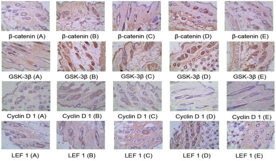 On the 22nd day, the skin of the depilated area on the back of the mice was fixed and added dropwise with blocking solution at room temperature for 20 min. The pretreated skin was added with GSK-3β antibody (1:200), rabbit β-catenin antibody (1:300), rabbit Cyclin D 1 antibody (1:50), and rabbit LEF 1 antibody (1:100), rinsed, and incubated overnight at 4 °C. The treated skin was then dripped with biotinylated goat anti-rabbit/mouse antibody, incubated at 37 °C for 30 min, washed three times with PBS, developed at room temperature, counterstained, mounted, and finally checked and calculated the optical density.