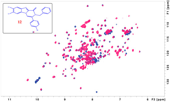 The expression and purification of 15N-labeled Pin1 was performed according to the known protocol [49,50]. The enzyme sample reached a final concentration of 200 µM in PBS buffer at pH = 6.5. Compound number 12 was dissolved in DMSO and added to the protein to achieve a final concentration of 1 mM in the NMR tube. The 15N-1H-HSQC experiments have been performed for the protein alone or with the compound on a Varian-900MHz-cold probe at the University of Colorado, Denver, USA. The number of points used in the indirect dimension were 128 with 32 scans. The spectra were processed using NMRPipe [51] and figures were created using Sparky [52] software.