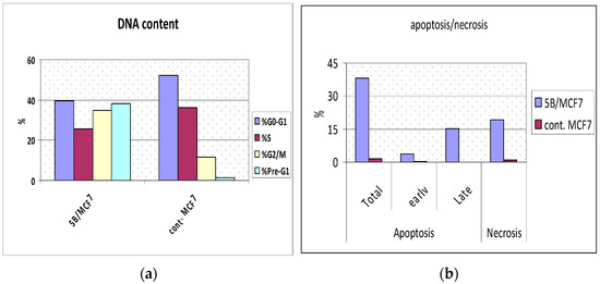 Apoptosis detection was performed by using Annexin V-FITC and PI apoptosis kit (eBioscienceTM, San Diego, CA, USA). Mcf cells were plated at a 600,000 cells/mL density onto a six well plate. After 24 h of incubation, the cells were treated with compound 8 at 10 mg/mL. Cells grown in media containing an equivalent amount of DMSO served as solvent control. After 24 h, the cells were stained with an Annexin V-FITC conjugate and propidium iodide (PI), and the percentage of apoptotic, necrotic, and living cells was determined according to the protocol provided by the Annexin V-FITC and PI apoptosis kit. The cells’ emitted fluorescence was analyzed by flow cytometry (NovoCyte, ACEA Biosciences Inc., San Diego, CA, USA) through the NovoExpress 1.3.0 software (ACEA Biosciences Inc., San Diego, CA, USA), acquiring 1 × 104 events per sample using the population plot “dot plot”, where each point corresponds to a single event with a specific fluorescence signal about the axes; Annexin V-FITC green fluorescence in abscissa vs. PE red fluorescence inordinate.