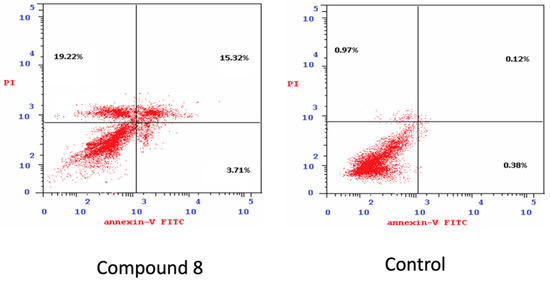 Evaluation of apoptosis induced by compound 8 treatment. Flow cytometry analysis for Annexin-VFITC/PI staining Left: compound 8 treated cells, Right: control.