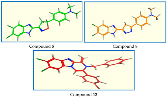 MOE (Chemical Computing Group Inc. software 2014, Montreal, QC, Canada) was used to build the 3D structures of some selected substituted benzimidazole 5, 8, and 12 in their neutral forms. The selected compounds represent the best anti-breast cancer activity.