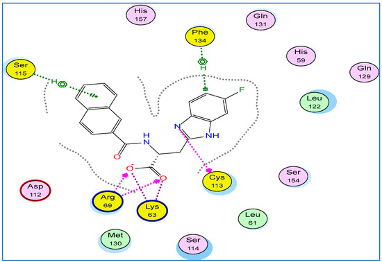 2D binding mode and residues involved in the recognition of reference ligand 3-(6-fluoro-1H-benzimidazol-2-yl)-N-(naphthalen-2-ylcarbonyl)-d-alanine (Arg69, Phe143, Ser115, Lys63, Cys113 (yellow).