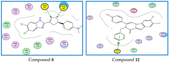 Compound 8 is well-positioned to interact with Lys63 and Arg69 amino acid residues via hydrogen bonding interaction with N and O atoms, while compound 12 is well-positioned to interact with Lys63 amino acid residue via the phenyl ring (Figure 9).