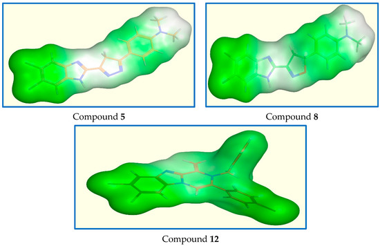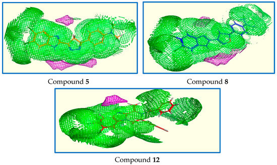 Surface map for compounds 5, 8, and 12. Pink, hydrogen bond, blue: mild polar, green hydrophobic.