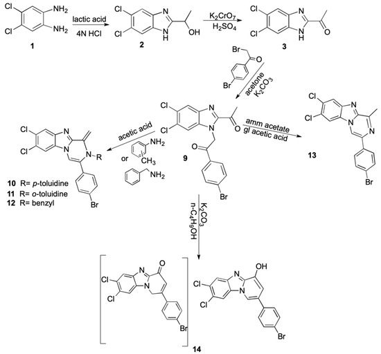 Scheme 2 focused on the synthesis of the new pyrazinobenzimidazoles (10–13) and pyridobenzimidazole 14. Compound 9 was synthesized by the reaction of compound 3 with p-bromophenacyl bromide and K2CO3 in acetone. The formed compound was confirmed by IR, 1H NMR and microanalytical data. The 1H NMR spectra of the product showed singlet peak of methylene protons at 6.19 ppm, also the IR spectrum showed 1654–1689 cm-1 bands belonging to the two (C=O) and the mass spectrometry showed [M + 2] in 1:1 molar ratio indicating the presence of Br atom. Compounds 10, 11 and 13 were prepared by reaction of compound 9 with p-toluidine, o-toluidine and ammonium acetate, respectively, in glacial acetic acid. The prepared compounds were confirmed by the IR spectrum which showed the disappearance of the two carbonyl bands (1654 and 1689) indicate the intramolecular cyclization. Moreover, the mass spectrometry of the compounds showed M+2 in 1:1 molar ratio indicating the presence of Br atom.