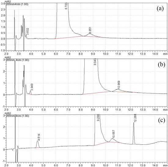 The mobile phase elution program was then optimized with the variation in water and methanol. For the isocratic elution of 20% methanol, the separation was not satisfactory, as shown in Figure 1a. When the percentage of methanol reduced to 15%, a new peak appeared close to the void time in Figure 1b. Therefore, gradient elution was selected for better separation. After careful optimization, the final elution program started with 10% methanol and increased to 50% at 10 min, then returned to the initial state at 11 min and equilibrated for the next injection. The retention time for four peaks was 4.499 min, 9.280 min, 10.554 min and 12.286 min, respectively (Figure 1c). The width of peak 3 was close to peak 2 (DNT), and this uncommon broadening needed further attention. Their UV spectra (220–300 nm) are shown in Figure S2. Similar spectra were observed with strong adsorption peaks appearing between 250 and 290 nm, with no adsorption peak above 300 nm. This UV profile confirmed that they had similar chromophores.
