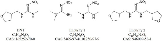 Neonicotinoids (NEOs), chemically similar to nicotine, are the most widely used insecticides in the global market [1]. They interfere with the nicotinic acetylcholine receptor of the pest’s nervous system. Based on the mode of action classification scheme, they are classified in group 4A by the Insecticide Resistance Action Committee [2]. As the first member of the third-generation NEOs (furanicotinyl class), dinotefuran (DNT) has no chloropyridine or chlorothiazole ring. DNT is a chiral pesticide and was commercialized by Mitsui Chemicals in 2002 [3]. It is a systemic insecticide and has no cross-resistance with former NEOs. As the DNT-related patents have expired, new registrations from different suppliers are increasing. During active substance evaluation and pesticide registration, sufficient impurity identification is indispensable, because the safety of a pesticide not only relies on the active substance, but also on the contained impurities.