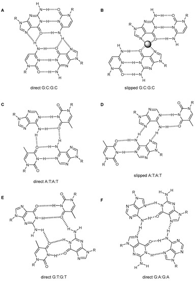 Direct and slipped major groove tetrads can be also formed by the association of A:T Watson-Crick base pairs (Figure 3C,D). The slipped alignment was found in the dimeric solution structure of the octamer d(GAGCAGGT) [35] and implies the formation of two N7(A)-H(N6)(A) additional hydrogen bonds. In the direct alignment, the inter-base pair hydrogen bonds are O4(T)-H(N6)(A). This tetrad has been observed as crystallographic contacts between unit cells in the dimeric propeller-like quadruplex structure of the human telomeric sequence, d(TAGGGTTAGGGT) [1]. Interestingly, these tetrads are not part of the G-quadruplex core but are formed between loop resides, connecting different quadruplexes and contributing to stabilize the crystal.