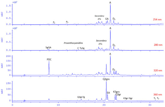 HPLC-DAD chromatograms of 50% water-methanol extract from leaves of Fragaria × ananassa cv. Senga Sengana (FaSS3, 1:200); λ given in red. Abbreviations: A, agrimoniin (10); C, catechin (6); D2, davuriciin D2 = fragariin A (not isolated); EA, ellagic acid (16); ETs, ellagitannins; 5gQA, 5-O-galloylquinic acid (5); I3gr, isorhamnetin-3-O-β-glucuronoside (14); K3gr, kaempferol-3-O-β-glucuronoside; K3grx, kaempferol-3-O-[β-xylosyl(1‴→2″)]-β-glucuronoside (13); P1 and P2, pedunculagin, α/β (7); PDC, 2-pyrone-4,6-dicarboxylic acid (1); Q3gr, quercetin-3-O-β-glucuronoside (miquelianin; 12); Q3grx, quercetin-3-O-[β-xylosyl(1‴→2″)]-β-glucuronoside (flagarin; 11); Q3gr7g, quercetin-3-O-β-glucuronoside-7-O-β-glucoside (9); Tx3g, (2R,3R)-taxifolin-3-O-β-glucoside (8); T1 and T2, tiliroside, trans/cis (15).