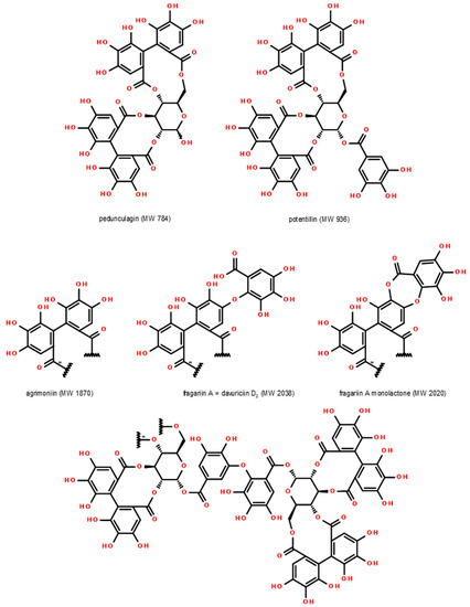 - Okuda, T.; Yoshida, T.; Kuwahara, M.; Memon, M.U.; Shingu, T. Tannins of rosaceous medicinal plants. I. Structures of potentillin, agrimonic acids A and B, and agrimoniin, a dimeric ellagitannin. Chem. Pharm. Bull. (Tokyo) 1984, 32, 2165–2173. [Google Scholar] [CrossRef]