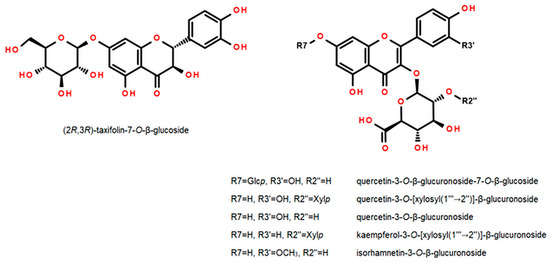 Flavonoids identified in the leaves of Fragaria × ananassa cv. Senga Sengana (compounds 8 (taxifolin-3-O-β-glucoside), 9 (quercetin-3-O-β-glucuronoside-7-O-β-glucoside), 11 (quercetin-3-O-[β-xylosyl(1‴→2″)]-β-glucuronoside), 12 (quercetin-3-O-β-glucuronoside), 13 (kaempferol-3-O-[β-xylosyl(1‴→2″)]-β-glucuronoside), 14 (isorhamnetin-3-O-β-glucuronoside).