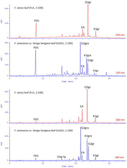 Summary of HPLC-DAD chromatograms attained for water-methanol extracts from F. vesca (Fv1, Fv2), and F. ananassa cv. Senga Sengana (FaSS1, FaSS2) leaves; λ given in red. Abbreviations: EA, ellagic acid (16); K3gr, kaempferol-3-O-β-glucuronoside (not isolated); K3grx, kaempferol-3-O-[β-xylosyl(1‴→2″)]-β-glucuronoside (13); PDC, 2-pyrone-4,6-dicarboxylic acid (1); Q3gr, quercetin-3-O-β-glucuronoside; Q3grx, quercetin-3-O-[β-xylosyl(1‴→2″)]-β-glucuronoside (flagarin; 11); Q3gr7g, quercetin-3-O-β-glucuronoside-7-O-β-glucoside (9).