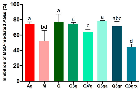 Antiglycation activity after seven days of incubation of BSA with MGO (0.5 mM) and tested compound (1.5 mM), expressed as % inhibition of MGO-mediated-AGE formation. The results are representatives of three experiments performed in triplicate ± SD; Values not sharing a common letter are significantly different at p < 0.05 by Tukey’s multiple comparisons test. Abbreviations: Ag, aminoguanidine (reference); M, metformin (reference); Q, quercetin (reference); Q3g, quercetin-3-O-β-glucoside (isoquercitrin; minor FaSS extracts constituent); Q4′g, quercetin-4′-O-β-glucoside (spireoside; reference); Q3ga, quercetin-3-O-β-galactoside (hyperoside; reference); Q3gr, quercetin-3-O-β-glucuronoside (miquelianin; 12); Q3grx, quercetin-3-O-[β-xylosyl(1‴→2″)]-β-glucuronoside (flagarin; 11).