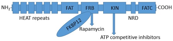 The mTOR protein contains multiple protein domains (Figure 1). Near the N-terminus are more than 20 repeats of Huntingtin, elongation factor 3, protein phosphatase 2A and TOR1 (HEAT) units, which form a hydrophobic surface that mediates protein–protein interactions and facilitates the localization of mTOR to the cell membrane. The next domain, a focal adhesion targeting (FAT) domain, consists of about 568 amino acids. The FAT domain forms specific interactions with a FAT domain at the C-terminus (FATC) to expose the kinase domain (KIN) [5]. The FK506-binding protein of 12 kD (FKBP12)-rapamycin binding (FRB) domain mediates interactions with the inhibitor rapamycin. After rapamycin binds to FKBP12, the FKBP12-rapamycin complex binds to the FRB domain, causing the KIN domain to undergo allosteric conformational changes, inhibiting the kinase activity. The KIN domain binds to both adenosine triphosphate (ATP) and ATP-competitive inhibitors. A serine- and threonine-rich negative regulatory domain (NRD) is located between KIN and FATC [5,6,7].