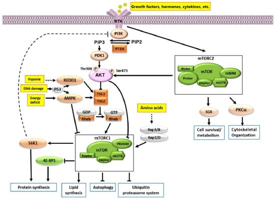 The complex responds to various stimuli, such as extracellular growth factors, stress, oxygen, and amino acids (Figure 2). Growth factors, hormones, cytokines, etc., activate mTORC1 directly or indirectly through PI3K and AKT [1,14]. Activated PI3K phosphorylates phosphatidylinositol (4,5)-biphosphate (PIP2) to form phosphatidylinositol (3,4,5)-triphosphate (PIP3), which binds to the pleckstrin homology (PH) domain of AKT [15]. This membrane-associated AKT is phosphorylated and activated, and it both directly activates mTORC1 and indirectly activates mTORC1 by inhibiting the interaction between tuberous sclerosis 1 (TSC-1) and tuberous sclerosis 2 (TSC-2). Dimerized TSC-1/TSC-2 inhibits the GTPase Ras-homolog enriched in brain (Rheb), which is required for mTOR activation; therefore, TSC-1/TSC-2 normally inhibits mTOR. However, activated AKT phosphorylates Ser939 and Thr1462 of TSC-2, preventing the formation of the TSC-1/TSC-2 complex and relieving the inhibition of Rheb [16,17,18].