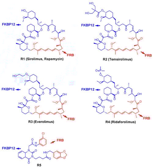 Structures of allosteric inhibitors of mTOR and representations showing the binding mode of them with FKBP12 (blue) and FRB (red). R1–R4: rapamycin and its derivatives; R5: non-rapalog allosteric inhibitor.