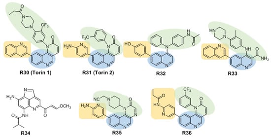 Liu et al., starting from a quinoline structure with mTOR inhibitory activity, obtained the compound Torin1 (R30, Figure 5) through structural modification. A six-membered cyclic lactam is an essential part of its activity; changing this lactam to a cyclic urea, carbamate or pyrimidinedione structure leads to a reduction in inhibitory activity of more than 500 fold. In addition, the introduction of a methyl group at the α or β position of the lactam ring significantly reduces the potency of the compound in biochemical and cellular experiments. R30 inhibits the phosphorylation of mTORC1 and mTORC2 in cells at concentrations of 2 nM and 10 nM, respectively [69]. The compound is approximately 1000-fold more active against mTOR than against PI3K, and the anti-mTOR activity is at least 100 fold higher than its activity against 450 other protein kinases. However, poor solubility, short half-life, and low oral bioavailability limited the further development of R30. As a continuation of R30, the compound Torin2 (R31) [70], obtained by removing a propionylpiperazine group and replacing the aminopyridine moiety with quinoline, has good mTOR inhibitory activity and selectivity, and shows good bioavailability (54%) and metabolic stability [71].
