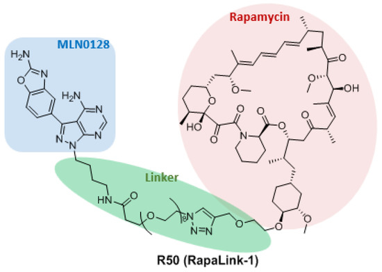 Drug resistance is a problem that has plagued the development of effective mTOR inhibitors. Mutations leading to resistance to mTOR inhibitors occur in both treated and untreated patients. Rodrik-Outmezguine et al. proposed a new drug combination design strategy to overcome the resistance problem of existing mTOR inhibitors. After the ATP competitive inhibitor MLN0128 and rapamycin molecules were modified with polyethylene glycol, they were linked by azide-alkyne cycloaddition to obtain the compound RapaLink-1 (R50, Figure 8), which has strong inhibitory effects on both rapamycin-binding site mutants and ATP-binding site mutants [93].