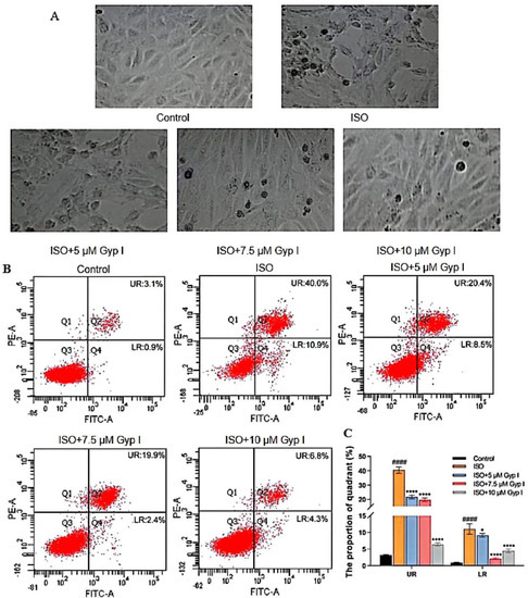 As shown in Figure 2A, compared with the Control group, the cell morphology of the ISO group was significantly damaged and deformed, accompanied by a large number of apoptotic bodies. The Gyp I-treated groups (5, 7.5, and 10 μM) significantly reduced ISO-induced apoptosis of H9c2 cells in a dose-dependent manner, and the cell morphology gradually returned to normal. To further explore the apoptosis inhibitory effect of Gyp I on ISO-induced cardiomyocyte injury, H9c2 cells were analyzed by flow cytometry. The upper right (UR) and lower right (LR) quadrants represent late and early apoptotic cells, respectively. The results indicated that Gyp I significantly attenuated ISO-induced apoptosis in a dose-dependent manner. Importantly, the Gyp I-treated group (10 μM) showed the best preventive effect; the ratio of UR and LR apoptotic cells were 6.8% and 4.3%, respectively (Figure 2B,C).