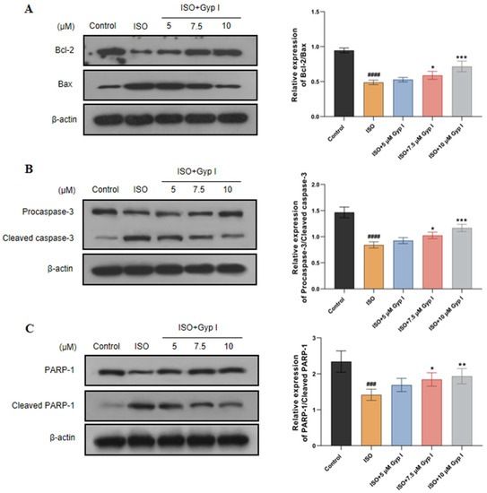 To further understand the mechanism of Gyp I protection regarding the regulation of apoptosis, we measured the effect of Gyp I on apoptosis-related protein expression using Western blot analysis. As shown in Figure 3A, compared with the Control group, the expression of the anti-apoptotic protein Bcl-2 was decreased in the ISO group, while the pro-apoptotic protein Bax was increased. Conversely, Gyp I dose-dependently increased Bcl-2/Bax expression compared with the ISO group. ISO-induced injury of H9c2 cells markedly reduced Procaspase-3 and PARP-1 expression, which resulted in caspase-3 activation and PARP-1 cleavage. However, Gyp I increased Procaspase-3/Cleaved caspase-3 and PARP-1/Cleaved PARP-1 expression ratios in a dose-dependent manner compared with ISO groups (Figure 3B,C). These findings suggest that Gyp I significantly inhibited ISO-induced expression of apoptosis-related proteins in H9c2 cells.