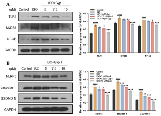 Effect of Gyp I on the expression of the TLR4/NF-κB/NLRP3 signaling pathway in vitro: (A) The relative expression of TLR4, MyD88, and NF-κB. (B) The relative expression of NLRP3, caspase-1, and GSDMD-N. Results are presented as mean ± SD of three independent experiments using one-way ANOVA followed by Tukey’s multiple-comparison test (####: p < 0.0001 compared with Control group; *: p < 0.05, **: p < 0.01, ***: p < 0.001, ****: p < 0.0001 compared with ISO group).