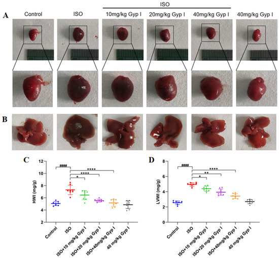 Effects of Gyp I on heart and liver morphology; HWI and LVWI of ISO-induced mice: (A) Cardiac morphology. (B) Liver morphology. (C) HWI. (D) LVWI. Analysis was conducted using one-way ANOVA followed by Tukey’s multiple-comparison test (n = 8, mean ± SD, ####: p < 0.0001 compared with Control group; *: p < 0.05, **: p < 0.01, ****: p < 0.0001 compared with ISO group).