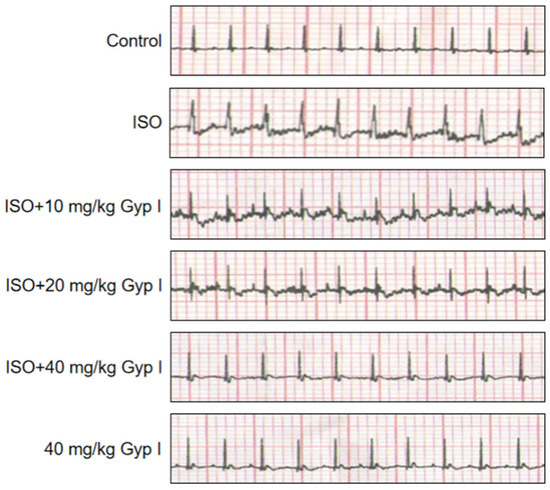 The effect of Gyp I on electrical activity was determined for the hearts of mice in all groups and was measured by electrocardiographic patterns. Figure 6 shows that ISO-treated mice exhibited depressed ST-segment, T-wave depression, and impaired myocardial contractility, in comparison to the normal ECG pattern observed in untreated mice. After Gyp I (10 and 20 mg/kg) intervention, mild ST-segment elevation and T-wave inversion were observed, respectively, which returned to normal ECG pattern with Gyp I (40 mg/kg). Surprisingly, the group treated with Gyp I alone showed an almost normal ECG pattern throughout the study period. Thus, the above finding indicated that ISO-induced cardiac function injury was gradually protected by Gyp I in a dose-dependent manner.