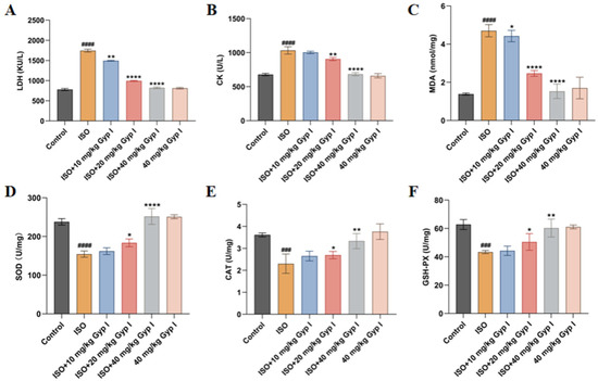 Biochemical assessment in serum and tissues of mice in each group: (A) LDH levels in serum. (B) CK levels in serum. (C) MDA levels in tissues. (D) SOD levels in tissues. (E) CAT levels in tissues. (F) GSH-PX levels in tissues (n = 5, mean ± SD, ###: p < 0.001, ####: p < 0.0001 compared with Control group; *: p < 0.05, **: p < 0.01, ****: p < 0.0001 compared with ISO group).