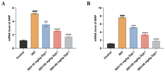 Effects of Gyp I on ISO-induced myocardial hypertrophy mRNA levels in mice: (A) ANP. (B) BNP (n = 3, mean ± SD, ####: p < 0.0001 compared with Control group; **: p < 0.01, ***: p < 0.001, ****: p < 0.0001 compared with ISO group).