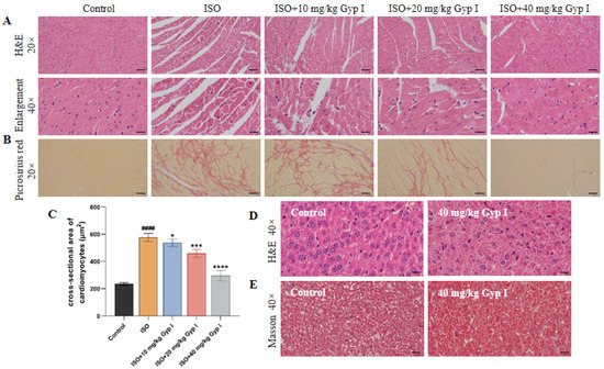 To determine the effect of Gyp I on ISO-induced cardiac hypertrophy, the cross-sectional area of cardiomyocytes in each group was calculated using Image J software. The cross-sectional area of cardiomyocytes in the normal group was 234.8 ± 7.9 μm2, while the cross-sectional area of cardiomyocytes around the inflammatory injury in the ISO group was significantly increased to 577.0 ± 24.3 μm2. The cross-sectional areas of peri-inflammatory cells in the low-, middle-, and high-dose groups of Gyp I were 537.4 ± 21.3 μm2, 459.7 ± 23.4 μm2, and 295.7 ± 31.1 μm2, respectively, which were significantly reduced compared with the ISO group (Figure 9C). We also performed H&E staining on liver sections, and the results showed that Gyp I administration alone had no effect on the mouse liver (Figure 9D). Masson staining showed that no inter-tissue collagen fiber hyperplasia was found in the group treated with 40 mg/kg Gyp I alone, which indicated that Gyp I had no toxic effect on liver tissue (Figure 9E).