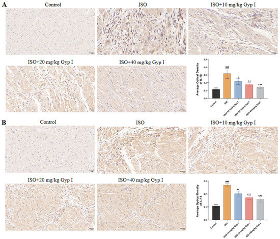 Immunohistochemical images of heart sections: (A) IL-1β. (B) IL-18 (Scale bar: 20 μm, n = 3, mean ± SD, ###: p < 0.001 compared with Control group; * p < 0.05, **: p < 0.01, ***: p < 0.001 compared with ISO group).
