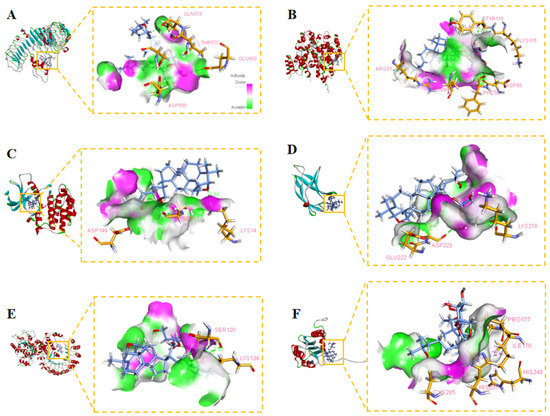 Furthermore, residues ASP550, SER552, THR577, GLN578, and GLU603 interacted with Gyp I and formed hydrogen bonds with the upstream protein TLR4 with a score of 115.271, and we deduce that TLR4 may be an essential target protein (Figure 13A and Figure 14A). Further, the LibDock score of IκBα was 113.576, and it displayed four hydrogen bonds involving LYS14, SER17, SER88, and ASP149 (Figure 13C and Figure 14C). Moreover, residues LYS218, GLU222, and ASP223 interacted with Gyp I and formed hydrogen bonds with the downstream protein NF-κB with a score of 121.299 (Figure 13D and Figure 14D); residues SER120 and LYS124 of NLRP3 formed hydrogen bonds with a score of 110.726 (Figure 13E and Figure 14E); and residues ARG178, GLY287, and ASP288 of caspase-1 formed hydrogen bonds with a score of 116.55 (Figure 13F and Figure 14F).