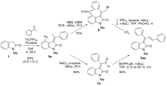 The disappointing results of the direct Knoevenagel strategy prompted us to apply a stepwise approach (Scheme 3). Using an acetophenone as a “partner” of Ti(OiPr)4/pyridine-mediated Knoevenagel condensation, 3-methyleneoxindole 5 was easily obtained from oxindole 1 in 93% yield with good Z-stereoselectivity (Z:E = 5:1). The preference for the Z-isomer could be explained by a chelation-controlled transition state [14]. The geometry of each isomer was confirmed by comparing 1H NMR data for (E)-5a [19] and the chemical shift of H4 [6.84 ppm (Z-isomer), 6.14 ppm (E-isomer)]. On 1H NMR analysis of known 3-arylmethylenoxindoles, the chemical shift of H4 is upfield (generally 6.50–6.00 ppm) compared to the usual aromatic area when the aryl group attached to the 3-methylene position of oxindole is located close to H4 [6,9]. Next, the methyl group should be transformed into a proper functional group to introduce the second olefin. Under radical bromination conditions [20], allylic bromide 6 was obtained as a single geometric isomer, regardless of the geometry of 5a. The structure of 6 was elucidated by intensive NMR studies, including HSQC, HMBC, COSY, and ROESY. In addition, the chemical shift of H4 was 6.11 ppm, which supported the (Z)-geometry of 6. The Krische group reported similar scrambling of olefin geometry during radical allylic bromination [21]. Unfortunately, the Wittig reaction of the corresponding ylide derived from 6 did not afford the desired 3aa. Given these disappointing results, we exchanged the positions of the functional groups in the Wittig reaction. Therefore, the second functionalization of the methyl group was allylic oxidation. After analyzing several oxidation conditions, we found that SeO2 oxidation [22] afforded aldehyde 7a in 84% yield, including as a single geometric isomer from both (Z)- and (E)-5a. Interestingly, the olefin geometry of 7a had the Z-configuration, which was confirmed by comparison with previously reported 1H NMR data for 7a [23]. In addition, the chemical shift of H4 for 7a also appeared at 6.26 ppm. The Z-stereoselectivity of allylic oxidation may have been due to coordination of the oxindole carbonyl group to selenium [24]. However, considering the high reaction temperature, the possibility of isomerization of (E)-7a to the more stable (Z)-7a during the reaction could not be excluded. Then, the Wittig reaction of aldehyde 7a with the ylide proceeded smoothly and provided the desired 3aa in 84% yield. The 1H and 13C NMR data of 3aa exactly matched the results obtained in our previous study [6].