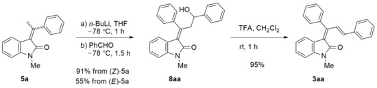 As shown above, the allylic oxidation/Wittig reaction strategy allowed synthesis of various 3-(1,3-diarylallylidene)oxindoles 3 from Knoevenagel adducts 5. However, decomposition of 5d in SeO2 oxidation limited the application scope of this strategy. Therefore, we investigated another stepwise approach, which could be applied to 5d and overcome the limitation of the first strategy. Based on the fact that the functional handle of the methyl group was located at the γ-position of the α,β-unsaturated carbonyl moiety, we assumed that aldol reaction may be feasible. In addition, several examples of similar aldol reactions were found in the literature [24,25,26]. According to the results of base screening, only n-BuLi could provide the desired aldol product, 8aa, in good yield (Scheme 4). The olefin geometry of 8aa was assigned as E, as the chemical shift of H4 appeared at 6.14 ppm. Notably, unlike bromination and allylic oxidation, the olefin geometry of 5a significantly affected the aldol reaction rate. Under optimized conditions, (Z)-5a was rapidly converted to 8aa in 91% yield, while the reaction of (E)-5a afforded 8aa in 55% yield. A longer reaction time and/or elevated reaction temperature did not increase product yield. The difference in reaction rate may have been caused by the lithiated intermediate from (E)-5a assuming a stable chelated form via coordination of the oxindole carbonyl group. Dehydration of 8aa proceeded smoothly under acidic conditions to provide 3aa in 95% yield [27,28].