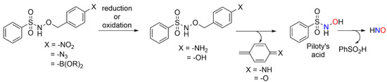 Redox-triggered HNO donors may possess value in probing biological crosstalk between HNO and other small redox active signaling agents, such as H2S or H2O2. The use of AS as a HNO donor is limited by the co-production of NO2−, a relatively fast and pH-insensitive release rate (t1/2~2.8 min, pH 4–8) and limitations in the synthesis of new donors [3]. Piloty’s acid (PA), another common HNO donor, decomposes to HNO and phenyl sulfinic acid (PhSO2H) at a neutral pH [3]. The aryl portion of PA tolerates structural modification while still supporting HNO release, which allows for the installation of designed redox-sensitive elements to initiate a 1, 6-elimination [20]. Scheme 1 shows Piloty’s acid derivatives designed to release HNO via a 1, 6-elimination mechanism upon exposure to either reductants or oxidants. These processes convert the azide, nitro or boronate ester groups into either the aniline or phenol derivative that should decompose to Piloty’s acid with the release of p-quinone methide or its imine (Scheme 1).