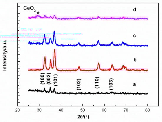 - Khanlary, M.R.; Hajinorozi, A.; Baghshahi, S. Influence of Ce Doping Concentration on the Structural and Optical Properties of Sol–Gel Derived ZnO:Ce Nanostructures. J. Inorg. Organomet. Polym. Mater. 2015, 25, 1521–1528. [Google Scholar] [CrossRef]