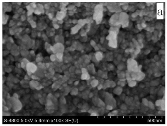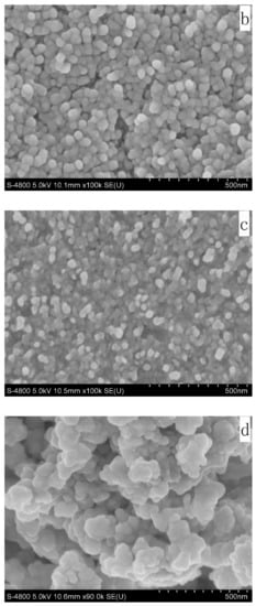 The crystal size increased and lattice constant decreased after Ce doping (Table 1). The ionic radii of Ce4+ and Ce3+ (0.087 and 0.115 nm, respectively) be larger than that of the Zn2+ ion of 0.074 nm [1]. The compressive strain is formed after doping of Ce. Changes in crystal structure after doping Ce indicate that Ce is incorporated into the ZnO matrix. SEM result indicated that film morphology of un-, 3%, 6% and 12% Ce-doped ZnO film diameter range in 8.6–31, 14–52, 18–56 and 20–91 nm, respectively (Figure 3). A hundred particles were selected and measured by Image J software. The 3% and 6% Ce-doped samples appear with a spherical morphology. There is a local agglomeration in the undoped and 12% Ce-doped sample, and the uniformity of the film after doping 3% and 6% Ce is obtained. In our previous work, the morphology of doped ZnO was changed from granular to rod when doping concentration is larger than 1% deposited on glass substrate by similar method [32,33,34]. However, in this work, the sample morphology do not change after larger than 1% Ce-doping, as well as lattice constant decreased after doping of larger ionic radii of Ce indicating the unique properties of Ce ions. It is maybe due to the dominant compressive strain on ZnO lattice caused by Ce enclosed in grain boundaries and prevents the growth further along the growing crystal orientation [35,36].The particle size increased after doping of Ce, consistent with the calculated size trend.