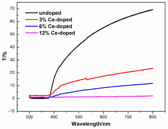 UV-vis optical transmittance of un-and Ce-doped ZnO films.