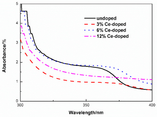 The film completely absorbs the ultraviolet (UV) light and transmits the visible light. The visible light transmittance decreases with increasing of Ce content (Figure 4). Numerous factors can influence film visible light transmittance. In our experiment, the decreased visible light transmittance is maybe due to crystal size increased after Ce-doping. UV-vis absorbance of un-and Ce-doped ZnO film displayed as Figure 5. The absorbance peak appears at about 300 nm. The absorption of near ultraviolet (370–400 nm) is stronger than the undoped one after doping of Ce ions. Optical gap values for un- and Ce-doped ZnO using the well-known Equation (4)