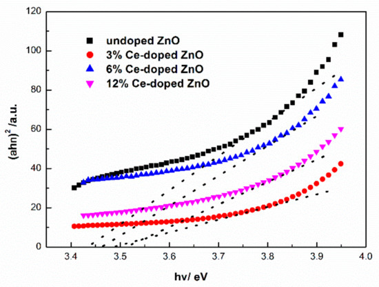 The value of absorption coefficient (a) is intercepted between 314–376 nm for calculating the band gap (Eg). The band gap of undoped, doping of 3%, 6% and 12% Ce ZnO is found to be 3.43, 3.49, 3.46 and 3.51 eV, respectively. The band gap increases after doping of Ce (Figure 6). The possible reason may relate to strain. The compressive strain widened band gap [37]. In addition, because of the Burstein–Moss effect also make the band gap widened [38]. The increase in the optical band gap brings it closer to the band gap width of p-type semiconductor materials and reaching better optical behavior for preparing ZnO heterostructured thin-film [39].